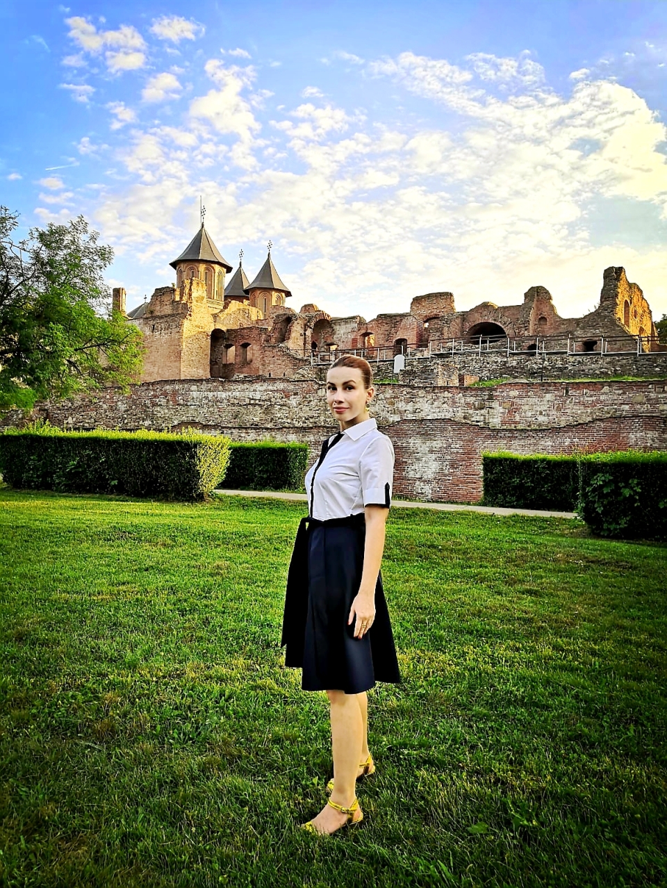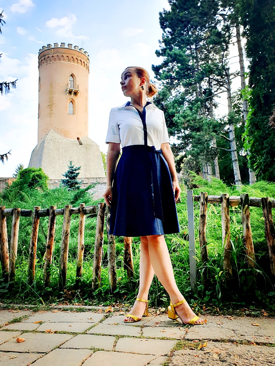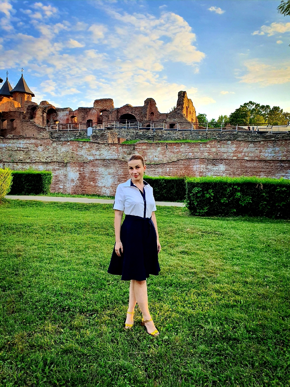 Rochia aleasă de mine are un aer vintage și este inspirată de silueta feminină din anii ’50. Este o rochie casual ideală pentru o siluetă clasică, tip clepsidră, ca a mea. În plus, pune în valoare curbele feminine, atât prin model, cât și prin îmbinarea cromatică perfectă.