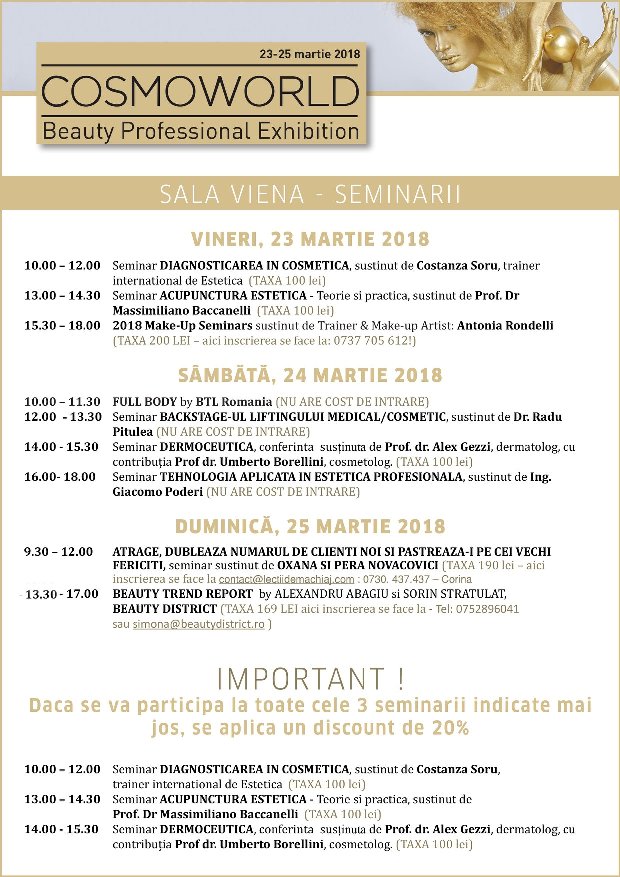 - Seminarul „Backstage-ul liftingului medical / cosmetic”, susținut de Dr. Radu Pitulea, are loc tot sâmbătă, 24 martie, de la ora 12.00. Acesta nu are taxă de participare.