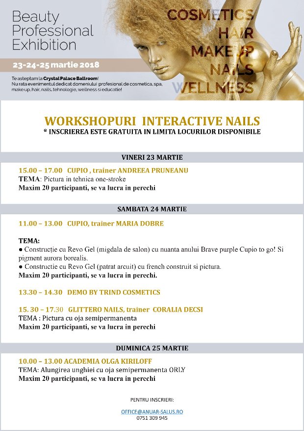 - Seminarul „Tehnologia aplicată în estetica profesională”, susținut de Ing. Giacomo Poderi, are loc tot sâmbătă, 24 martie, de la ora 16.00. Nici acesta nu are taxă de intrare.