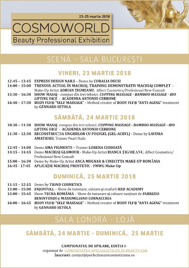 În perioada 23 – 25 martie 2018, Capitala se bucură de un nou eveniment dedicat esteticii: Cosmoworld. La Crystal Palace Ballrooms din București sunt invitați specialiști de renume în cosmetică, SPA, coafură, machiaj, manichiură și pedichiură, wellness, tehnologie și educație, care vor prezenta tehnici și secrete atât profesioniștilor din domeniul beauty profesional, cât și marelui public. Evenimentul se poate lăuda cu nume mari din industrie, precum Alexandru Abagiu – make-up artist și Sorin Stratulat – hairstylist, dar și cu prezența unor specialiști din domeniul medical și… dincolo de el.