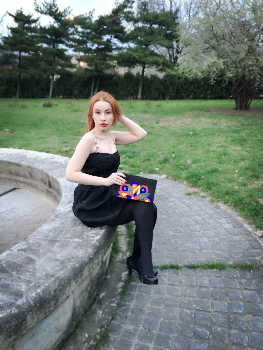Am spus deja că rochia neagră este mai mult decât fashion statement. Așadar, pentru a trece de la ținută de zi la ținută de seară, am renunțat la cămașa moale, color block și am înlocuit poșeta imensă de laptop cu una creată manual din mărgele colorate. O adevărată explozie de culoare! Am asortat poșeta de seară cu o centură superbă, cu motive etno. Ambele accesorii sunt tot de la Borro Design, handmade de femei din India, Indonezia și Vietnam.