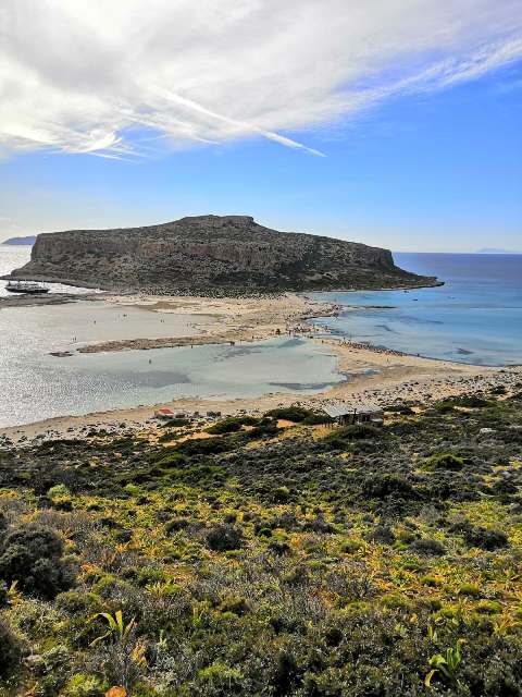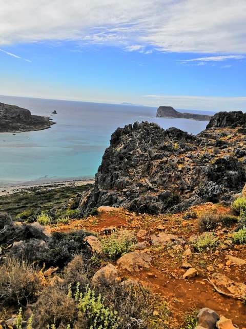 La Balos ai ocazia să cobori și să tot cobori, pe o potecă muntoasă, într-un decor selenar. Dacă ești leneș, poți să testezi măgărușii, dar traseul e frumos și merită făcut la pas. Când ajungi, înțelegi pe loc ce înseamnă o altfel de vacanță în Grecia: peisajul selenar se pierde într-un decor superb.