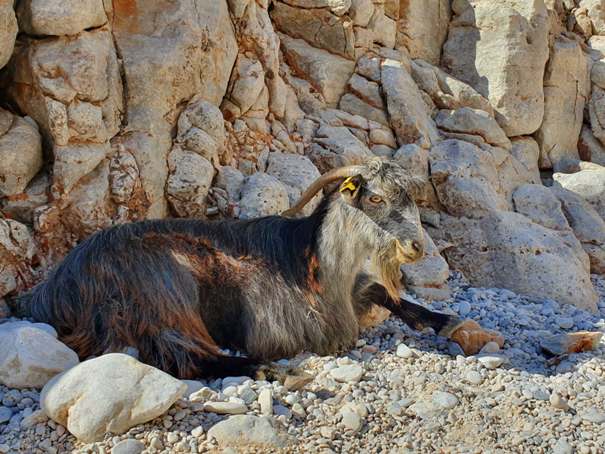 Plaja de la Seitan Limania este cea mai mică dintre cele trei pe care le-am vizitat, iar aici se ajunge cel mai greu. Coborârea e stâncoasă, prăpăstioasă și potrivită doar celor cu dor de ducă. Însă mie mi-a plăcut cel mai mult. Și nu doar pentru că numele locului are conotații demonice. Golful se află între doi munți, stâncile, nisipul și pietrele sunt albe, iar apa turcoaz e cu adevărat irezistibilă. Aici vei găsi cele mai mai multe capre kri-kri, gata mereu să-ți mănânce proviziile. Dacă te încearcă curiozitatea, pot deja să-ți spun că într-o confruntare dintre o blondă și un țap kri-kri, țapul câștigă fără să miște un deget.