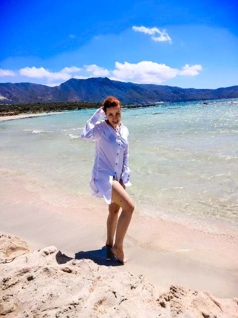 O insulă masivă de piatră se unește cu țărmul, exact ca la Elafonisi. Nisipul e roz și aici, apa e turcoaz, iar stâncile au forme desprinse din basme.