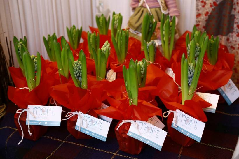 Pentru o astfel de ocazie aș recomanda cel mai mare și mai însorit aranjament, în care să se insereze și o plantă – o floare care să continue să crească, așa cum crește familia respectivă. Combinație cromatică: alb, galben, portocaliu, roz somon și verde (cu accent pe galben și portocaliu). Aranjamentul poate fi asimetric, ca să obținem un aspect natural de flori abia culese. Și varietatea e mare: lalele, Hortensia, Solidago, trandafiri Vuvuzela, Matthiola, Craspedia, Waxflowers, Bupleurum, Lisianthus și o plantă suculentă – HoyaKerrii -, în formă de inimă.