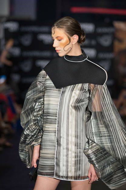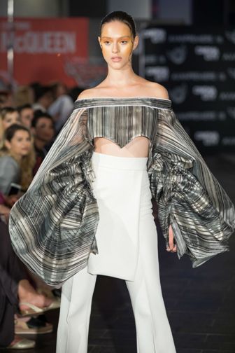 Corsetele, rochiile cu mâneci supradimensionate, pantalonii evazați cu talie înaltă și jachetele dramatice sunt răsfățate în umbre de intensități diferite. Accesorizate cu beltbags de la Wild Inga, ținutele create de Alexandra Calafeteanu reușesc o incursiune prin toate etapele prin care trece femeia autentică, evidențiindu-i intensitatea trăirilor: inocența, maturitatea, curajul, fronda, revolta, sex appeal-ul, caracterul dominator, dar și vulnerabilitatea.